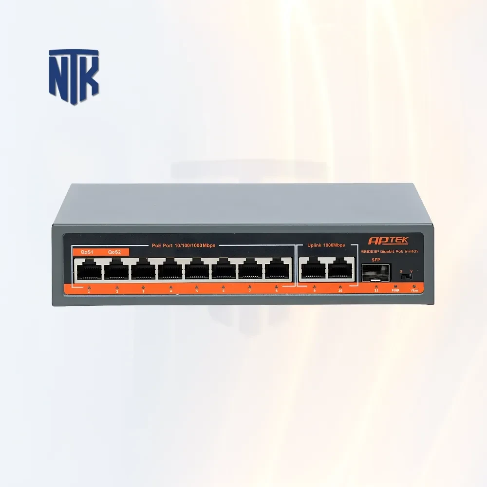 Switch PoE với 8 Port Aptek SG1083P là một Switch 8 Port PoE+ theo chuẩn IEEE 802.3af/at, hỗ trợ 30W mỗi port theo dạng End-span. Nghĩa là mỗi cổng RJ45 PoE có thể cấp nguồn trực tiếp cho camera IP, Access Point WiFi hoặc các thiết bị PoE khác mà không cần adapter rời, giúp giảm dây điện lằng nhằng trong tủ rack.
